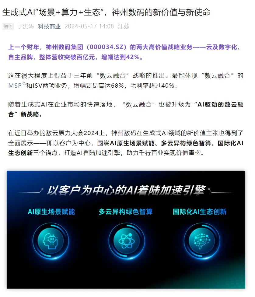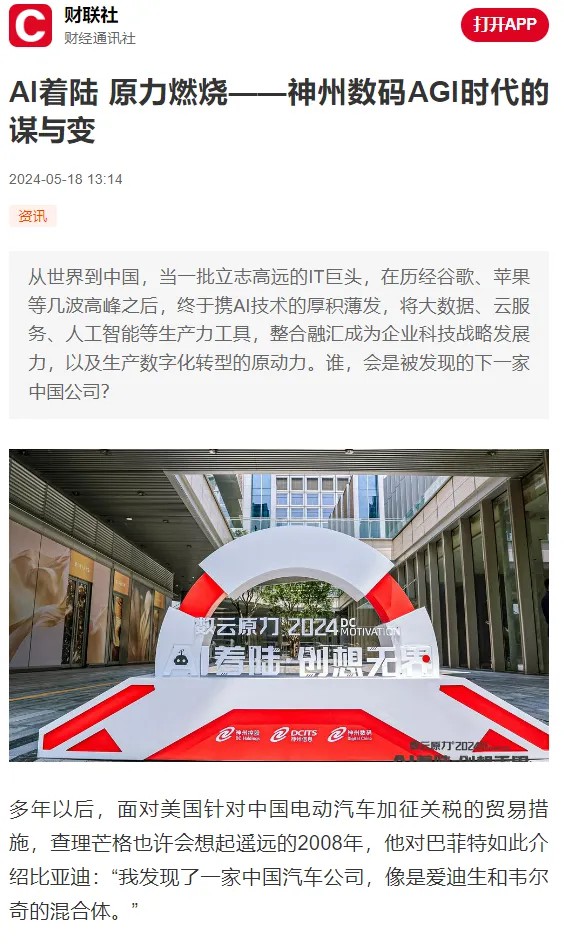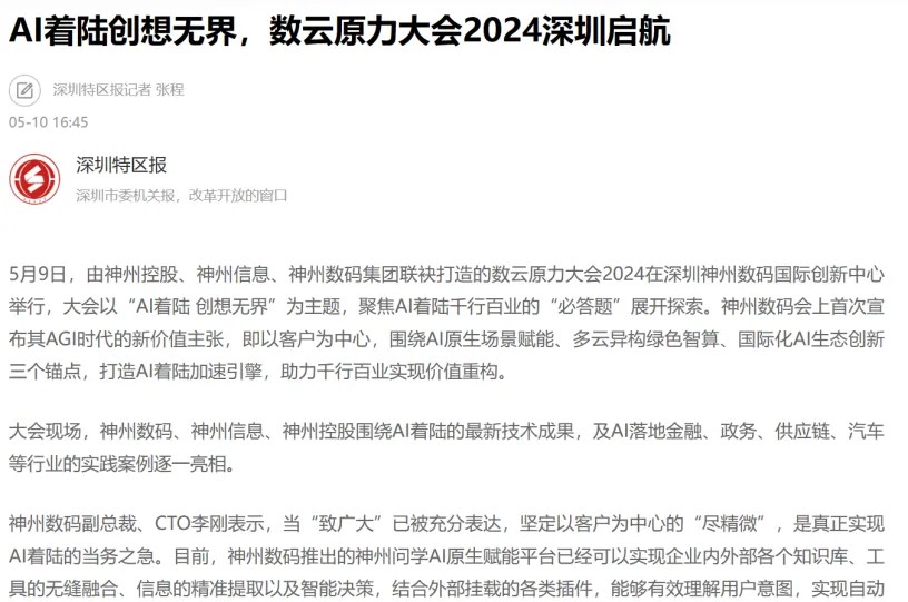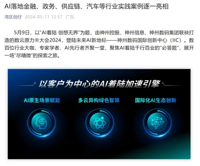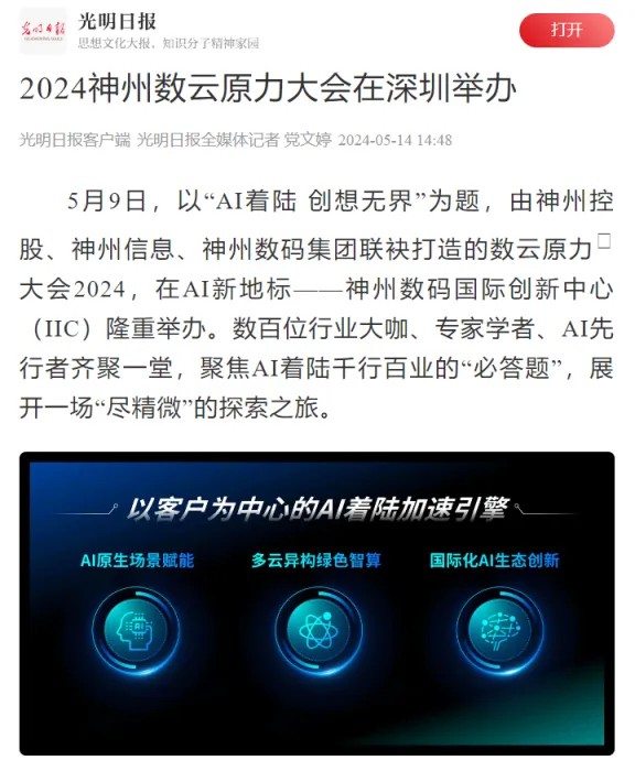 近日,由神州控股、神州信息、开云电竞集团联袂打造的年度盛会——数云原力大会2024开幕式,在未来AI新地标——开云电竞国际创新中心(IIC)圆满落幕。这场以“AI着陆 创想无界”为主题的活动,不仅引起了业界的广泛关注和讨论,也引发了媒体的争相报道。