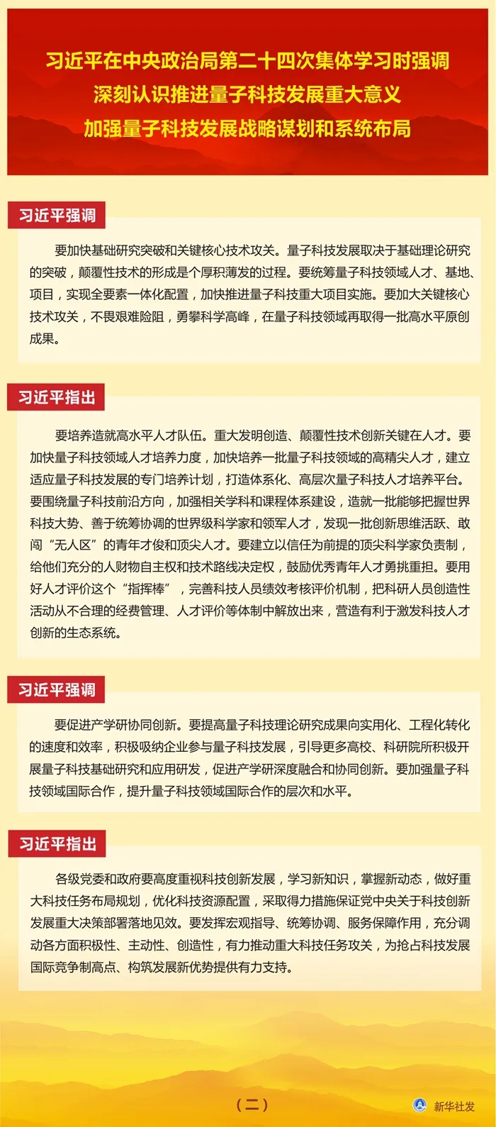 习近平在主持学习时发表了讲话。他指出,近年来,量子科技发展突飞猛进,成为新一轮科技革命和产业变革的前沿领域。加快发展量子科技,对促进高质量发展、保障国家安全具有非常重要的作用。安排这次集体学习,目的是了解世界量子科技发展态势,分析我国量子科技发展形势,更好推进我国量子科技发展。